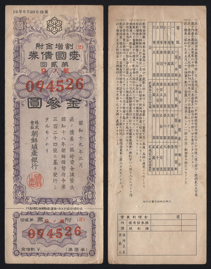 1944 Á¶¼±½Ä»êÀºÇà Á¦2ȸ ¾Ö±¹Ã¤±Ç 3¿ø(¹Ìǰ+)-094526(¹øÈ£¹è¿­¿¡·¯)